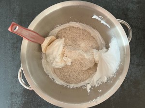 Jag knackar av marängen på vispen ned i bunken och tillsätter nötmjölsblandningen. Därefter vänder jag noga, men försiktig ned de torra ingredienserna i marängen.