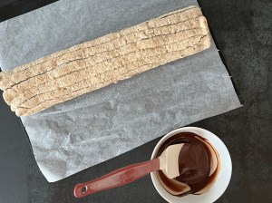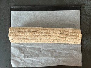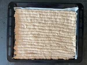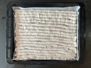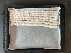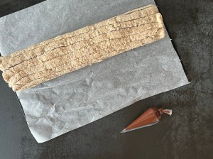Jag klär en plåt med bakplåtspapper och för över marängsmeten i en spritspåse. Med fördel använder man en tyll med runt hål. Jag har ingen och klippte därför ett hål istället. Sen spritsar men plåtlånga stavar uppifrån och ner på plåten. Försök att få dem jämntjocka, ca 17-20st. Och bakar av marängen i förvärmd ugn.