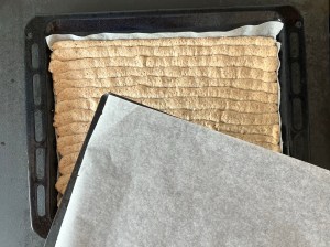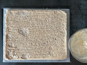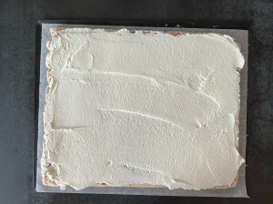 När marängen är klar får den svalna på plåten innan jag lägger en bakplåtspappersklädd plåt ovanpå och vänder den upp och ned. Pillar sen av pappret från botten. Försiktigt så att man inte drar sönder botten.