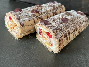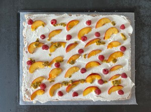 Nu vispar jag grädde, med lite bakpulver i, skär nektarinerna i tunna halvmånar, skrapar ur passionsfrukten och blandar. Sen brer jag ett tunt jämnt lager grädde över hela. Fördelar ut nektarin, skedar passionsfrukt och lägger på färska hallon. Sist rullar jag samman marängen, sakta och varsamt så att frukten stannar kvar.