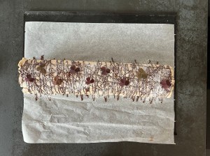 Nu är det dags att dekorera. Jag smälter mörk choklad, häller det i en spritspåse och låter den svalna lite. Sen klipper jag ett tunt hål i påsen och ringlar chokladen över hela rullen. Låter rullen stå cirka 10minuter så att chokladen hinner stelna lite. Sen pudrar jag med florsocker och dekorerar med oxalis. Man kan även dekorera med snyggt spritsad grädde och färska bär.