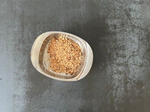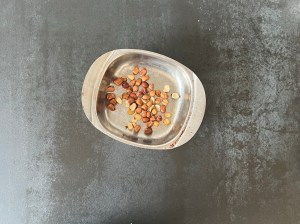 Strax innan smöret stelnar blötlägger jag hasselnötter som jag sen rostar, först själva och i slutet med kokosflakes. Låter dem svalna och hackar dem sen för att rulla bollarna i.