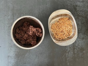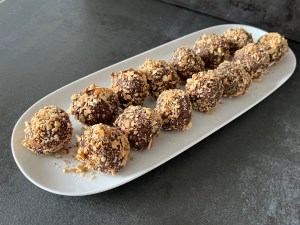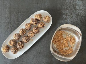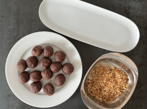 Smeten väger jag i 35g bitar som jag rullar och lägger åt sidan tills alla är rullade. Efter det rullar jag dem i hasselnöts- och kokosblandningen och serverar.