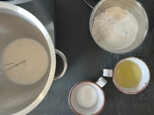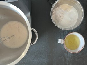 Jag börjar med att väga upp alla torra ingredienser förutom socker i en skål, sen väger jag de andra för sig. Löser upp jästen i vattnet, tillsätter socker och vispar samman, sen tillsätter jag oljan och vispar för att efter det låta det stå i 5min så att jästen och sockret börjar arbeta tillsammans. Efter 5min kan man se att det bubblar/skummar lite i vätskan.