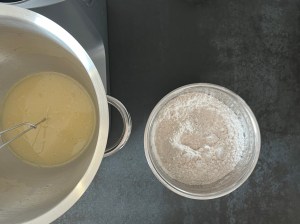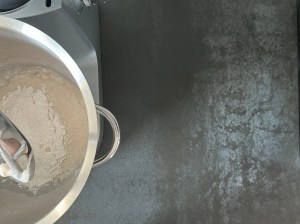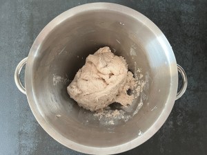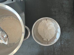 Under tiden jästen vaknar till liv så startar jag ugnen och blandar de torra ingredienserna till en mjölmix. Jag tillsätter hälften av mjölet i vätskan och arbetar in i maskinen. Därefter tillsätter jag resten av mjölet och arbetar in i degen, sen ökar jag farten i maskinen och kör den strax över halv fart i 3-4min. Tänk på att alltid använda vingen i din köksassistent. När den är klar skrapar jag samman den i degbunken.