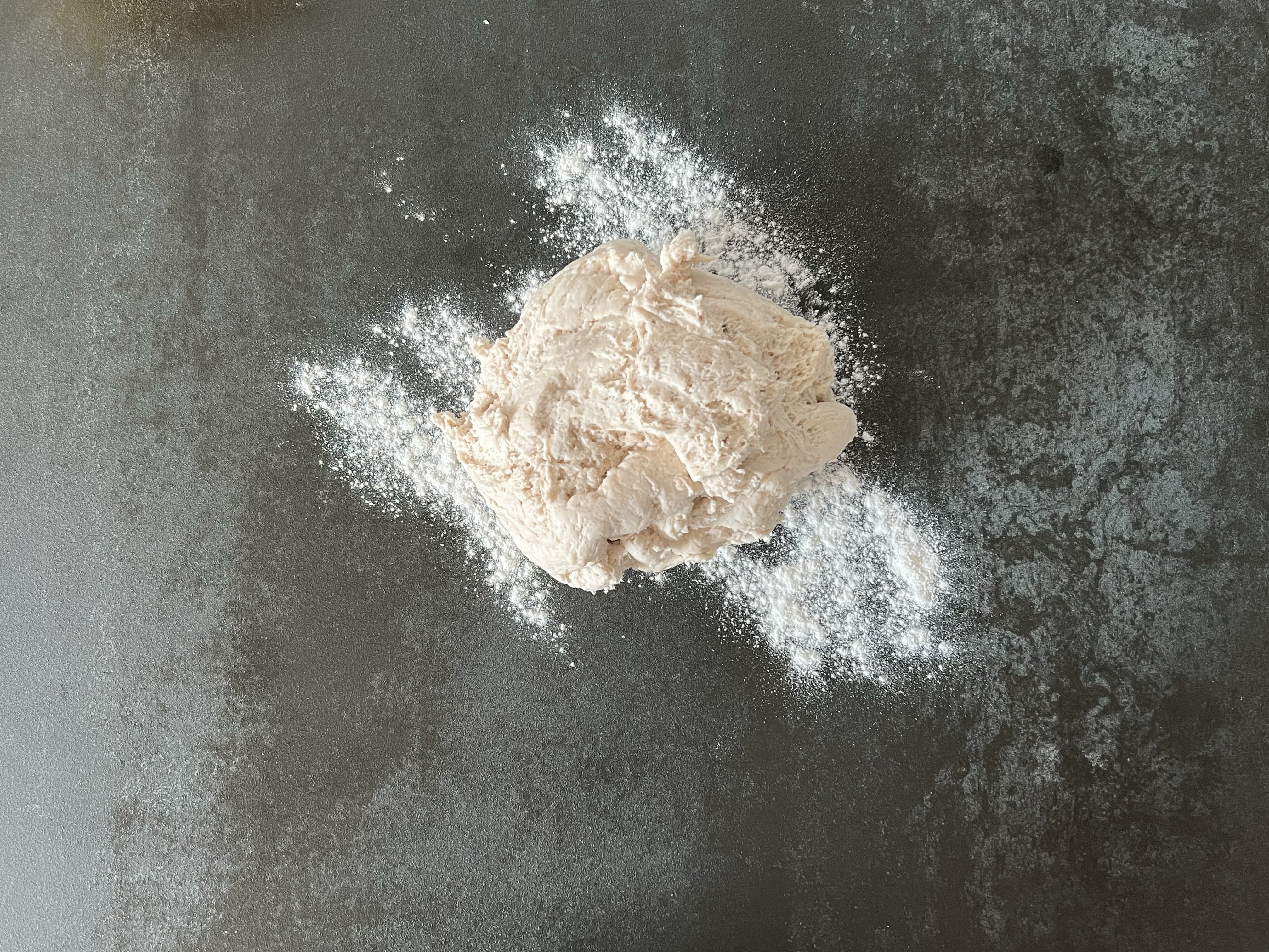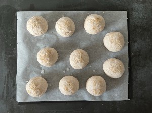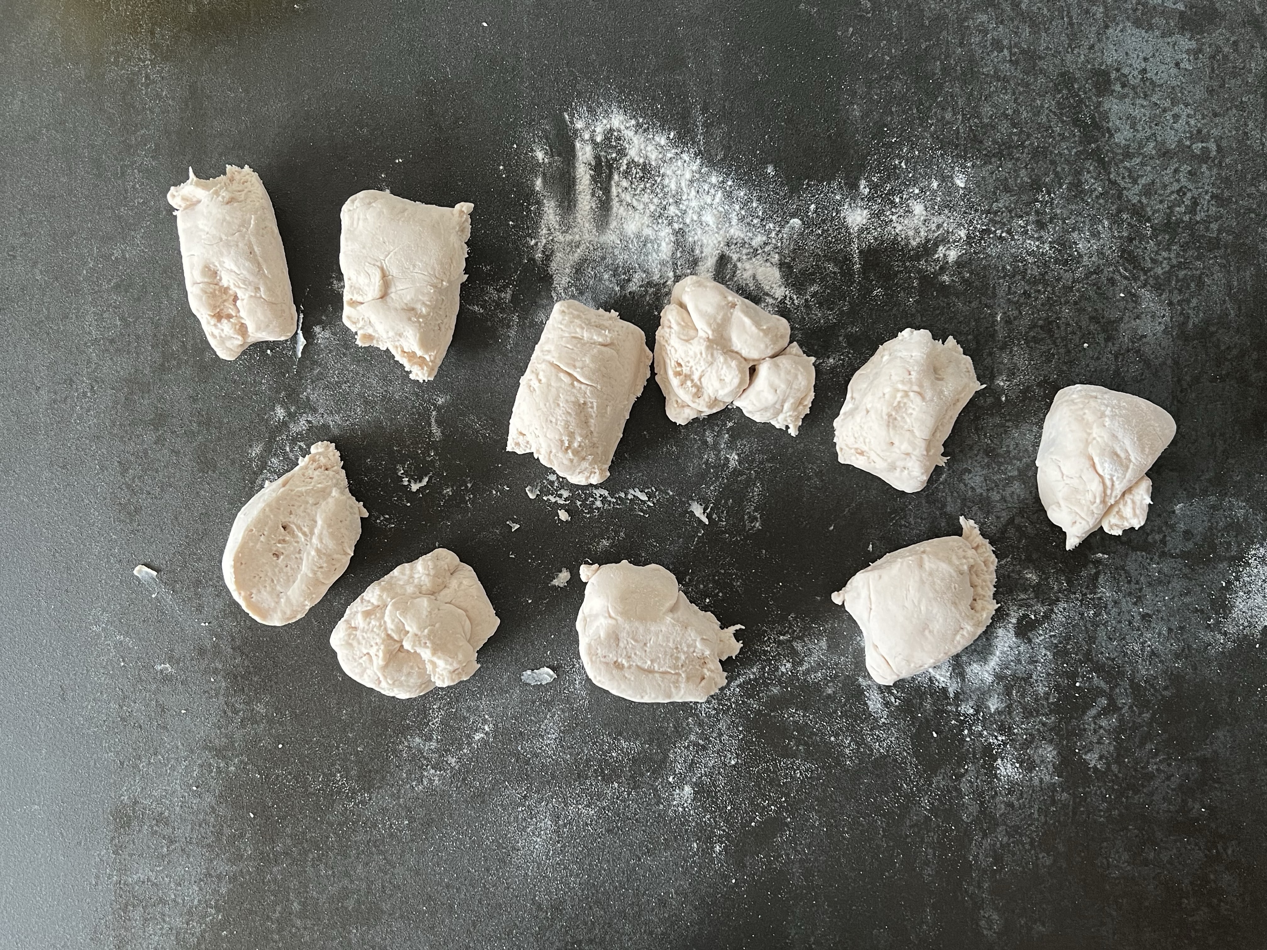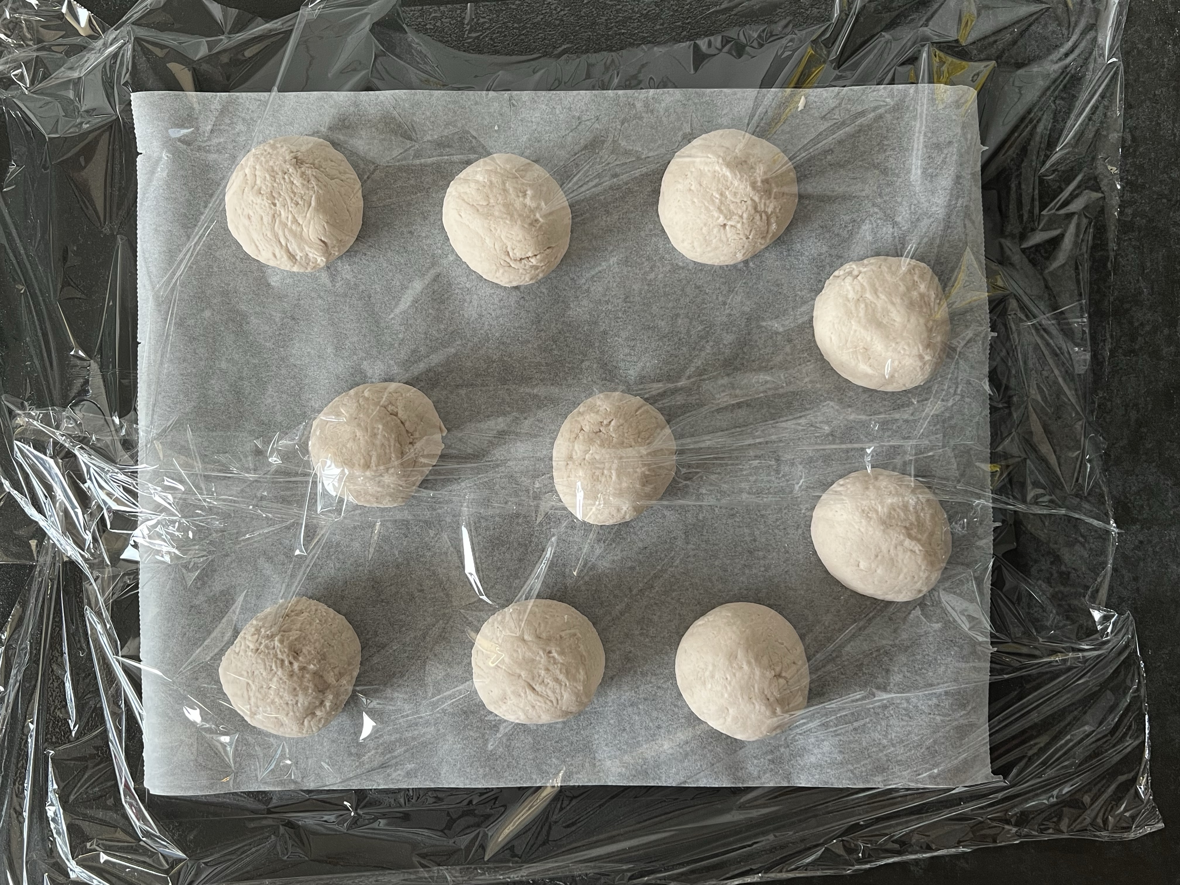Direkt när degen är klar tar jag upp den på mjölad bänk, delar den i 10st lika stora bitar och formar till runda bollar, med lätt mjölade händer. Jag plastar bollarna lätt och jäser i 20min.