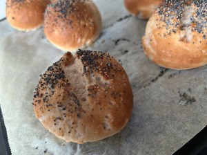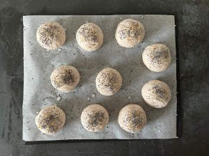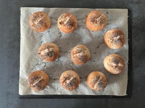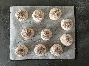 När de jäst klart blandar jag vatten och potatismjöl som jag penslar dem med. Ett bra alternativ till ägg. Sen toppar jag dem med vallmofrön och snittar dem med en vass kniv. Degen är lite kladdig så torka av kniven mellan varje snitt, annars blir det fult, hackigt och kladdigt. Därefter stoppar jag in dem i ugnen, sänker värmen från 250 till 225 … och bakar av dem. När de kommer ut ur ugnen får de svalna på ett galler.
