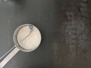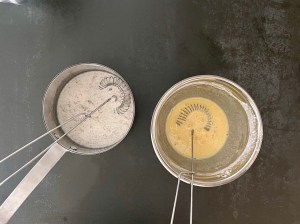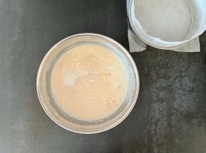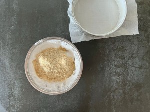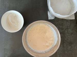 När den är färdigvispad siktar jag ned mjölmixen och vänder ned den i smeten med en slickepott.