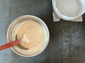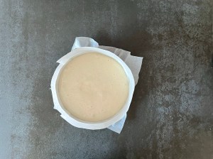 Lägg ett bakplåtspapper i botten på en springform, 18cm i diameter och smörj kanten med smör och fäst en remsa bakplåtspapper även mot kanten