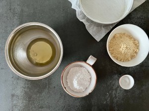 Blanda mjöl, xantangummi, salt och bakpulver i en skål