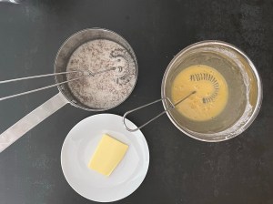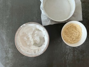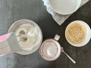 Jag börjar med den vanliga botten. Väger upp ägg och socker i en bunke och de övriga torra ingredienserna i en skål. Ägget och sockret vispar jag i vattenbad tills det är ca 37…!! Då tar jag av det från värmen och vispar tills det är vitt och pösigt.