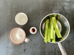 Häll rabarber, socker, vaniljpulver och vatten i en kastrull. Koka upp och sänk sedan värmen till strax under hälften.