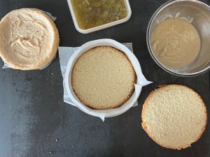 Montering, att sätta samman alla moment, det är så tillfredställande. Jag klär om en springform med bakplåtspapper. Skär tårtbotten i två lika tjocka skivor, med fördel används en tårtsåg. Lägg bottenbiten i botten på formen, med den bakade delen nedåt. Lägg på ett lager rabarberkompott. Därefter lägger man på mandelbotten och fyller den med vaniljcrème. Ovanpå vaniljcrèmen lägger man nästa botten och överst breder man ett tunt lager rabarberkompott.