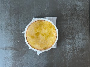 Bakar sedan av den och när den kommer ur ugnen så lägger jag ett bakplåtspapper ovan på, och en plåt, sen vänder jag den pp och ned för att låta den svalna,