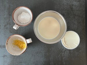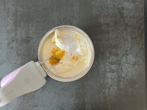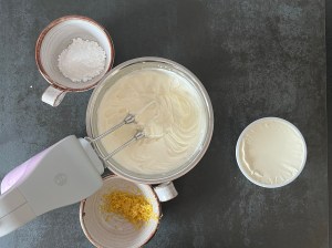 Tillsätt mascarpone, citronzest och florsocker i grädden