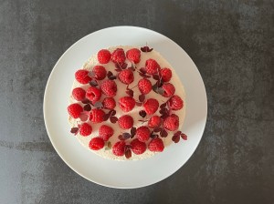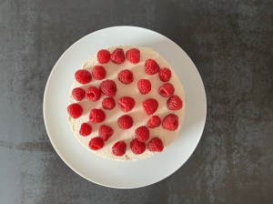 Att klä tårtan gör den inte bara snygg, den håller även ihop och smakar bättre. Jag sätter min på återfaller direkt och arbetar runt om med mascarponekräm. Man kan även sprits om man tycker att det är lättare, eller snyggare. Ovanpå dekorerar jag med färska hallon och oxalis.