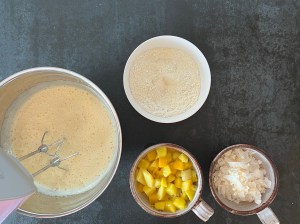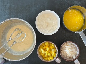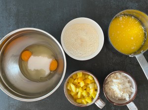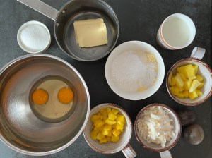 Jag börjar med att tina mango och annans, sen möter jag upp alla ingredienser. Socker och ägg för sig, mjölk och smör för sig och de andra torra tillsammans. Toppingen för sig såklart. När det är gjort smälter jag smöret och tillsätter mjölken i smöret. Sen vispar socker och ägg vitt och pösigt samt blandar frukten i en skål. Om ananasbitarna är lite för stora så skär jag ner dem i mindre bitar,