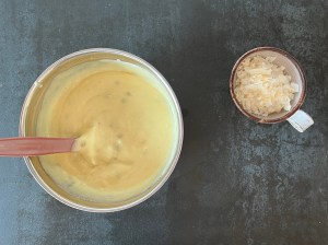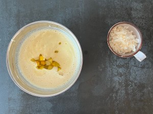 Efter det tillsätter jag smörmjölken i äggsmeten och vispar ut på låg hastighet. Efter det tillsätter jag mjölmixen som jag blandat samman i en skål och vispar slätt på låg hastighet.