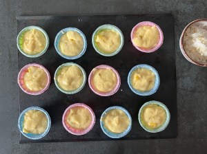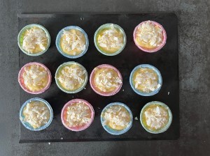 Efter det fördelar jag smeten i 12st formar och toppar dem med kokosflakes. Sen bakar jag av dem. När de är färdiga får de svalna på ett galler.