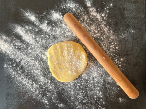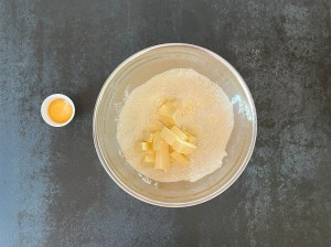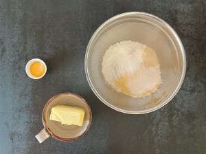 Jag börjar med degen till skalet. Blandar de torra ingredienserna i en skål, tärnar det kalla smöret och lägger en äggula i en liten skål.