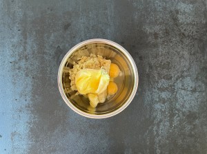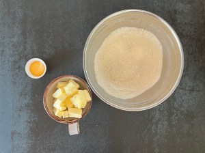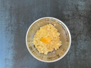 Nyper in smöret i mjölmixen till en grynig massa och tillsätter sedan äggulan och blandar till en deg. Jag använder en träsked när jag blandar degen.