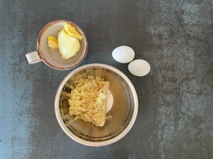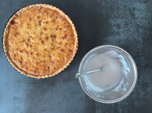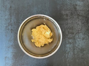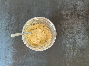 När degen vilar i kylen gör jag fyllningen, jag gör den i två omgångar. Dels tycker jag att det är lättare att blanda lite i taget. Men även för att få lika mycket till undre som övre lagret. Jag river mandelmassan grovt och blandar den sedan till en jämn smet med mjukt smör och ägg. Jag använder en gaffel i en bunke.