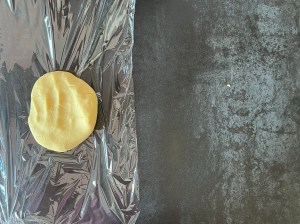 Degen plattar jag och plastar. Kyler den i tio till femton minuter.