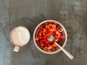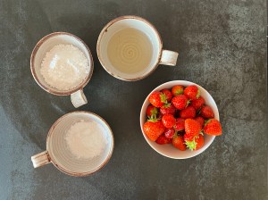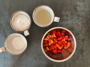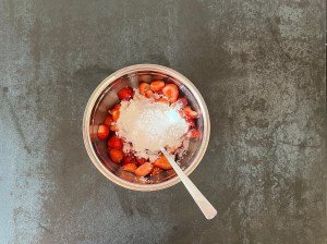 Jordgubbsfyllningen blandas även den när degen ligger i kylen. Jag sköljer, ansar och delar jordgubbarna. Sen blandar jag dem med flädersaftkoncentrar. Blandar sedan florsocker och potatismjöl och blandar ned det i jordgubbarna, som sedan får stå och dra i lagen.