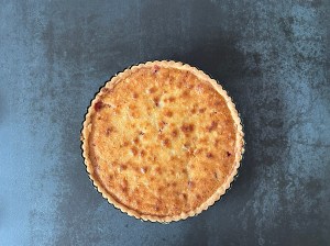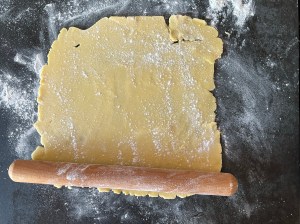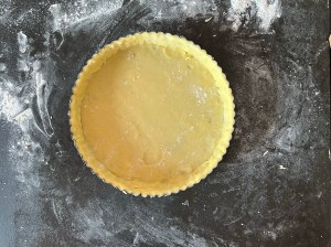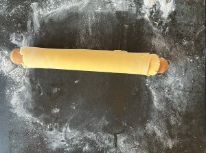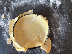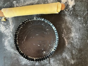 När degen har vilat klart smörjer jag en form med löstagbar botten, en sön där man kan lyfta upp botten ur formen. Sen kavlar jag ut den på en mjölad bänk. Strör lite mjöl över och rullar upp den på kaveln. Efter det rullar ah den över formen och de kanter som inte täcks, där degen går sönder, de klär jag med kantbitarna.