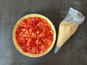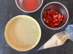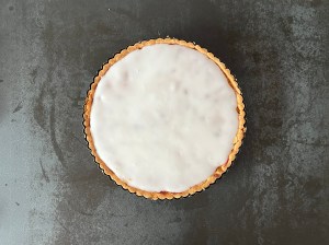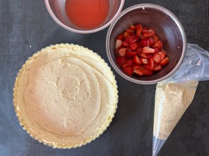 När formen är klädd är det dags att fylla den. Jag spritsar en av mandelfyllningarba i botten, jämnar sedan till med en palett eller liknande. Jag breder även lite av fyllningen på insidan av degen, för att skydda mot de blöta jordgubbarna.