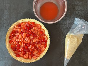 Sen häller jag av jordgubbarna i en sil och fördelar dem på fyllningen. Jag tar även några skedar av lagen som jag sparat och slår över jordgubbarna.