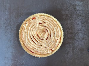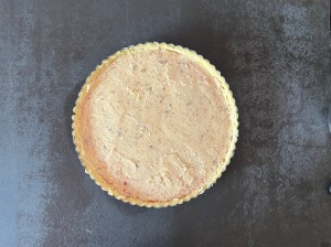 Efter det spritsar jag ut den andra mandelfyllningen i ett jämnt lager och breder sedan försiktigt den till ett jämnt lager och bakar av kakan i nedre delen av ugnen.