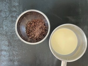 Chokladganachen är enkel att göra. Hacka chokladen och värm grädden tills precis innan den kokar. Slå grädden över chokladen och låt stå i 3min. Vispa sedan till en slät och blank smet med elvispen. Låt svalna så att den blir krämig. Man kan låta den gå in och ut ur kylen var 10-15min och röra i den, om man vill att den ska stelna snabbare.