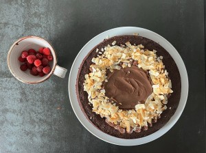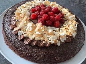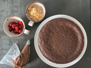 Monteringen är smidig. Spritsa eller bred ut ganachen på kakan, rosta kokosflakes (eller köp färdigrostade, toppa ganachen med kokos och hallon.