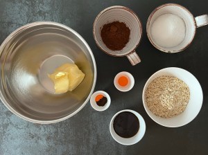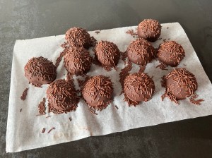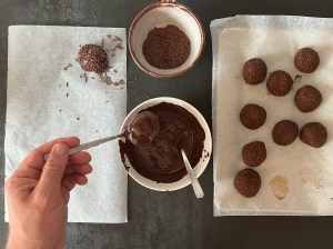 När de stelnat hackar och smälter jag chokladen och väger upp chokladströssel. Sedan doppar jag dem en i taget, låter dem rinna av, ställer dem sedan på ett nytt bakplåtspapper och strör över chokladströssel.