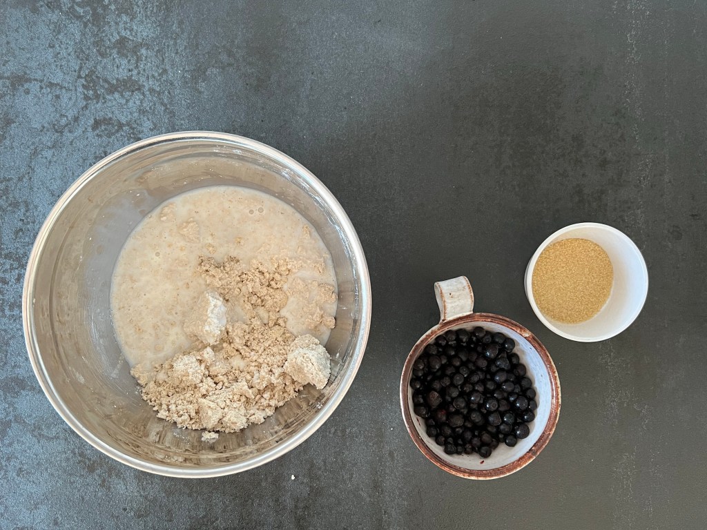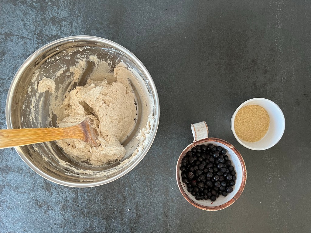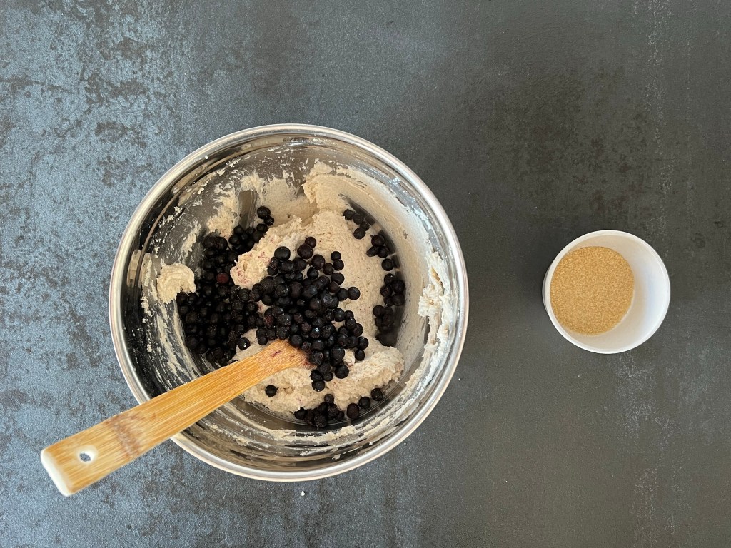 Sist tillsätter jag frysta blåbär och blandar ned i degen med träsleven. Jag brukar ha mina blåbär i frysen tills det är dags att blanda i dem i smeten, så blir det mindre blåbärssaft och kladd.
