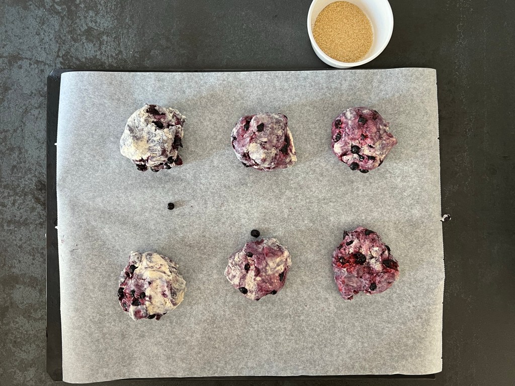 Efter det väger jag upp degen i 6st lika stora bitar som jag formar till bollar och lägger på en bakplåtspappersklädd plåt, sist pressar jag ut dem. Innan gräddning kan man välja två vägar. Antingen så strör man på lite rårrösocker och får lite mer sötma och textur i dem, eller så låter man bli. Båda sätten ger grymt goda scones.