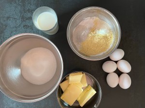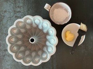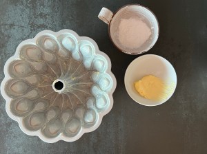 Först väger jag upp allt. Sedan penslar jag formen med rumsvarmt smör, (viktigt att inte smälta det, då fastnar för mycket mjöl), och pudrar med potatismjöl inuti, ser till att det kommer mjöl i alla hörn och vinklar och knackar ut överflödigt. Under tiden smälter jag även smöret till smeten.