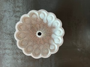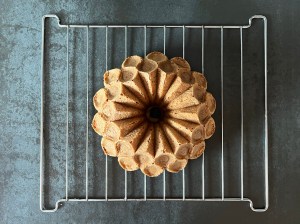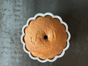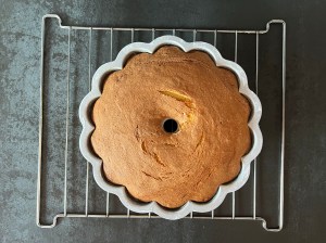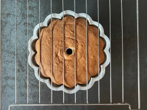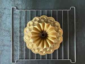 När kakan kommer ur ugnen får den vila i formen i 15min innan jag vänder upp den och stjälper den ur formen och låter den svalna helt.