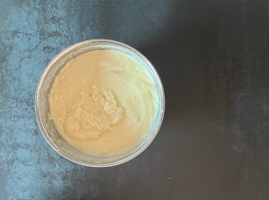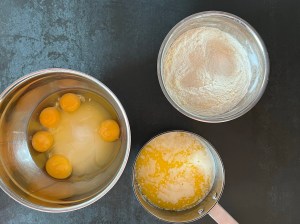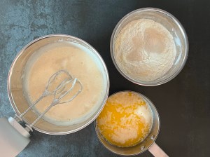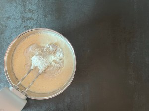 Efter det blandar jag det smälta smöret med mjölken, rör samman mjölmixen med en gaffel och vispar ägg och socker vitt och pösigt. Tillsätter smörmjölken i äggsmeten och vispar samman på låg hastighet.