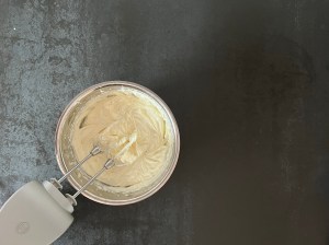Vispa mascarpone med grädde och vaniljsocker till en fast kräm