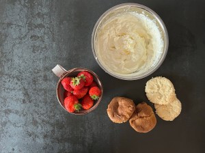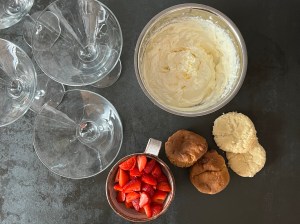 En mascarponekräm smaksatt med citron och självklart ett gäng färska jordgubbar. Förbered och baka drömmarna några dagar innan det är dags. Baka muffinsen, gärna samma dag, eller dagen innan. Därefter vispar man samman mascarpone med vispgrädde och vaniljsocker, samt pressar citronsaft.
