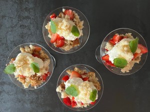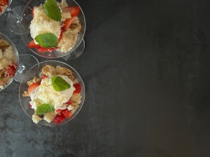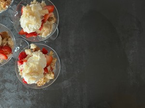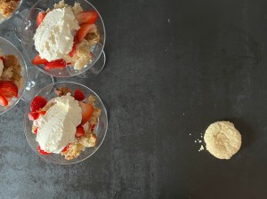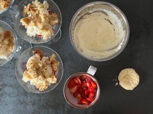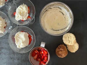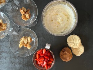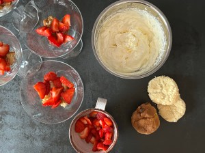 När man har alla delar på plats är det dags att varva allt i glasen. Jag börjar med muffinsen som jag bryter ned i mindre bitar och lägger i glaset. Ovanpå läger jag lite delade jordgubbar, en klick mascarponekräm och sedan krossade drömmar. Sen börjar man med nästa lager. Muffins, jordgubbar, mascarponekräm och sist drömmar.