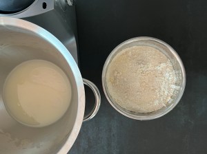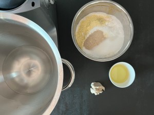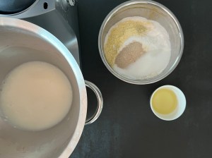Vi tar det från början. Först blandar jag alla torra ingredienser i en skål. Väger upp vatten, jäst och olja. Löser upp jästen och tillsätter oljan