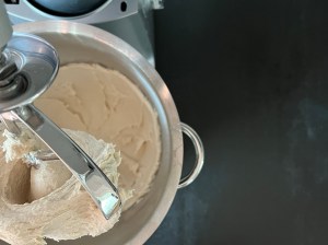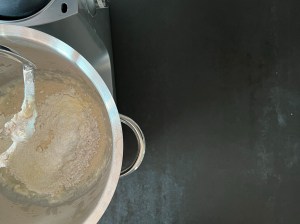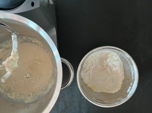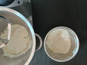 Sen tillsätter jag hälften av mjölmixen och blandar samman, tillsätter resten av mjölet och kör maskinen i ca 5min, på ganska hög fart, 4 av 6 på min maskin. Skrapar sedan samman degen och låter den vila i 10minuter.