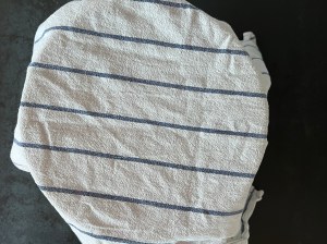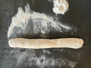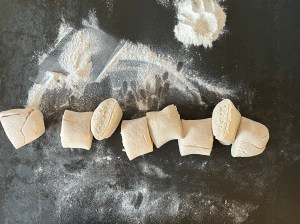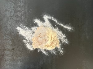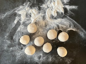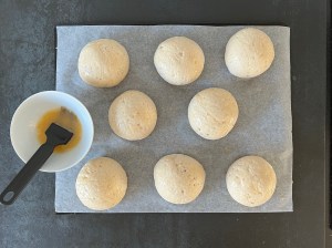 När degen vilat tar jag upp den på mjölad bänk och knådar den lätt. Rullar en jämntjock korv och delar i 8st lika stora bitar. För säkerhets skull kontrollväger jag dem också, så att de ligger på ca 100g styck. Sen rullar jag jämna bollar med lätt mjölade händer och fördelar dem på en plåt.