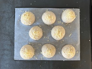 Plastar plåten lätt och låter dem jäsa. Efter det penslar jag dem med vispat ägg och toppar med riven ost. Jag valde en lagrad prästost från Allerum, för att få en god smak i osten, men det är en smaksak. Bakar av dem och låter dem sedan svalna på ett galler.