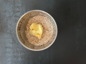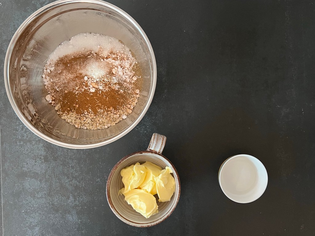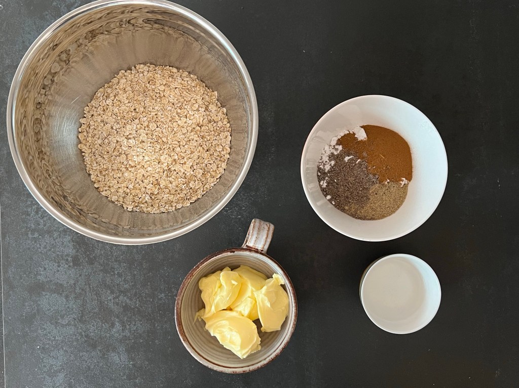 Jag börjar med att väga upp allt. Havre för sig. Socker och kryddor i en skål och smör samt vatten för sig. Sen blandar jag alla torra ingredienser.
