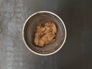 Efter det tillsätter jag smör och vatten och blandar allt med en gaffel. När allt är sammanblandat knådar jag det kraftigt med handen några gånger.