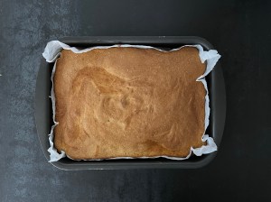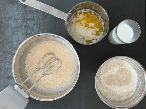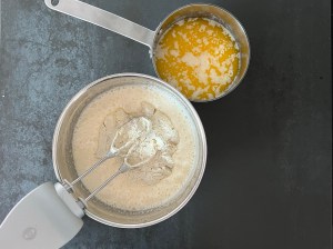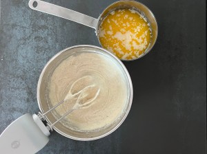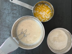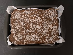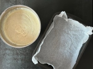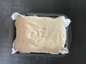 Efter det tillsätter jag mjölmixen och vispar samman på låg hastighet och efter det smörmjölken som jag också vispar samman på låg hastighet. Sen häller jag smeten i en form klädd med bakplåtspapper och bakar av.